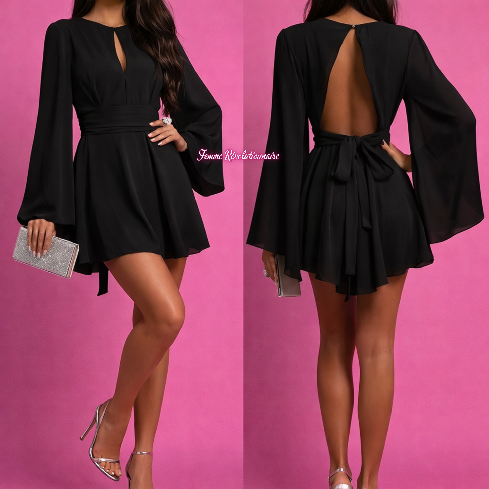 Abito velato con scollatura a goccia davanti e schiena scoperta sul retro, maniche a pipistrello e cinturina regolabile posizionabile davanti o dietro.