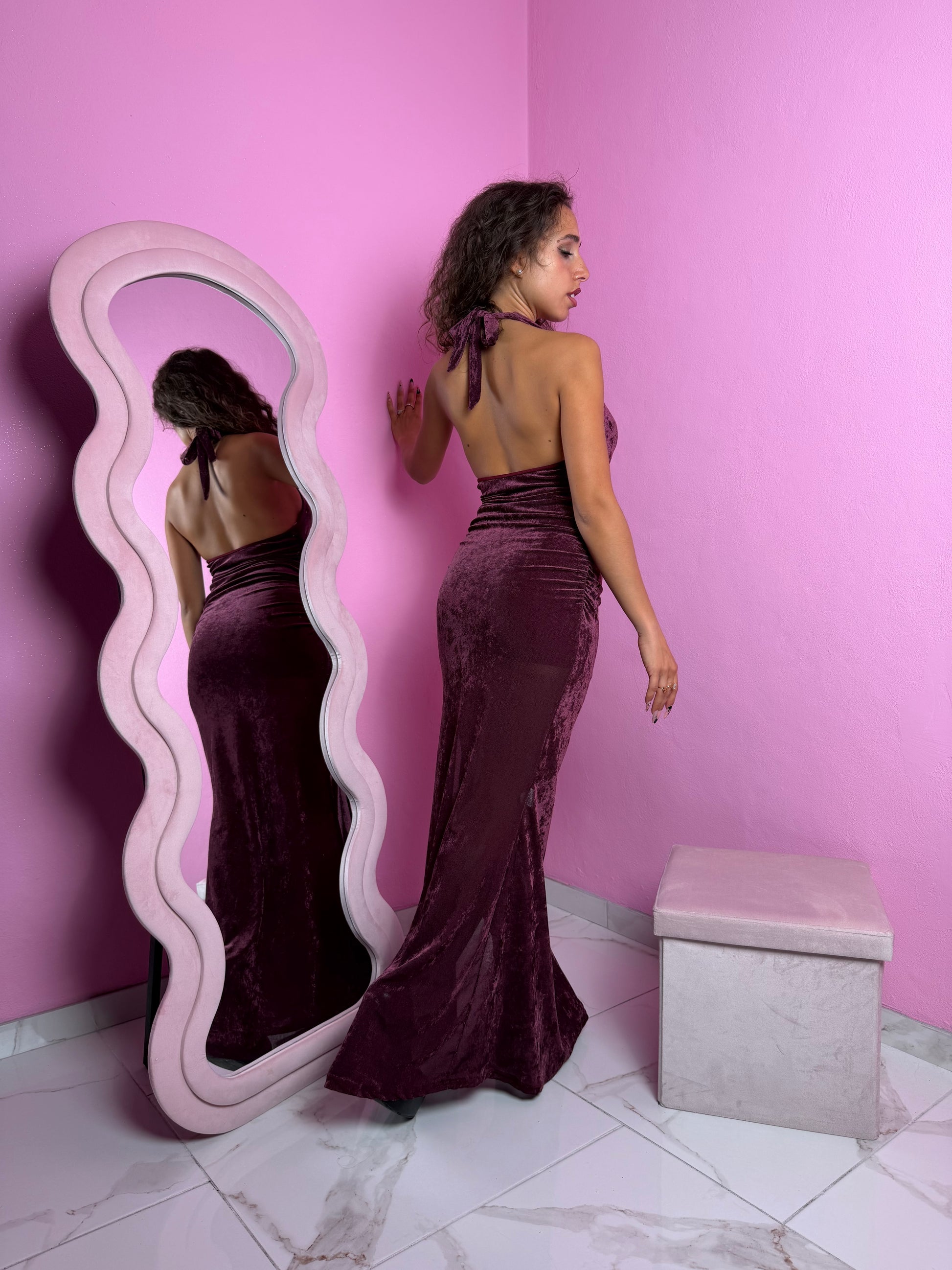 Abito vellutato con allacciatura al collo, schiena scoperta e scollo con ferretto che lo rende rigido.