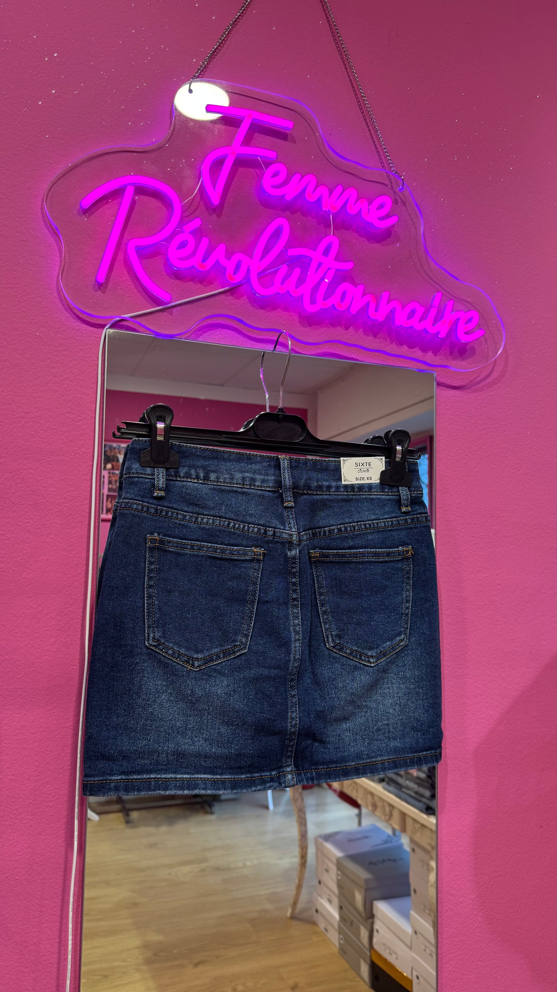Minigonna di jeans con pantaloncino sotto.