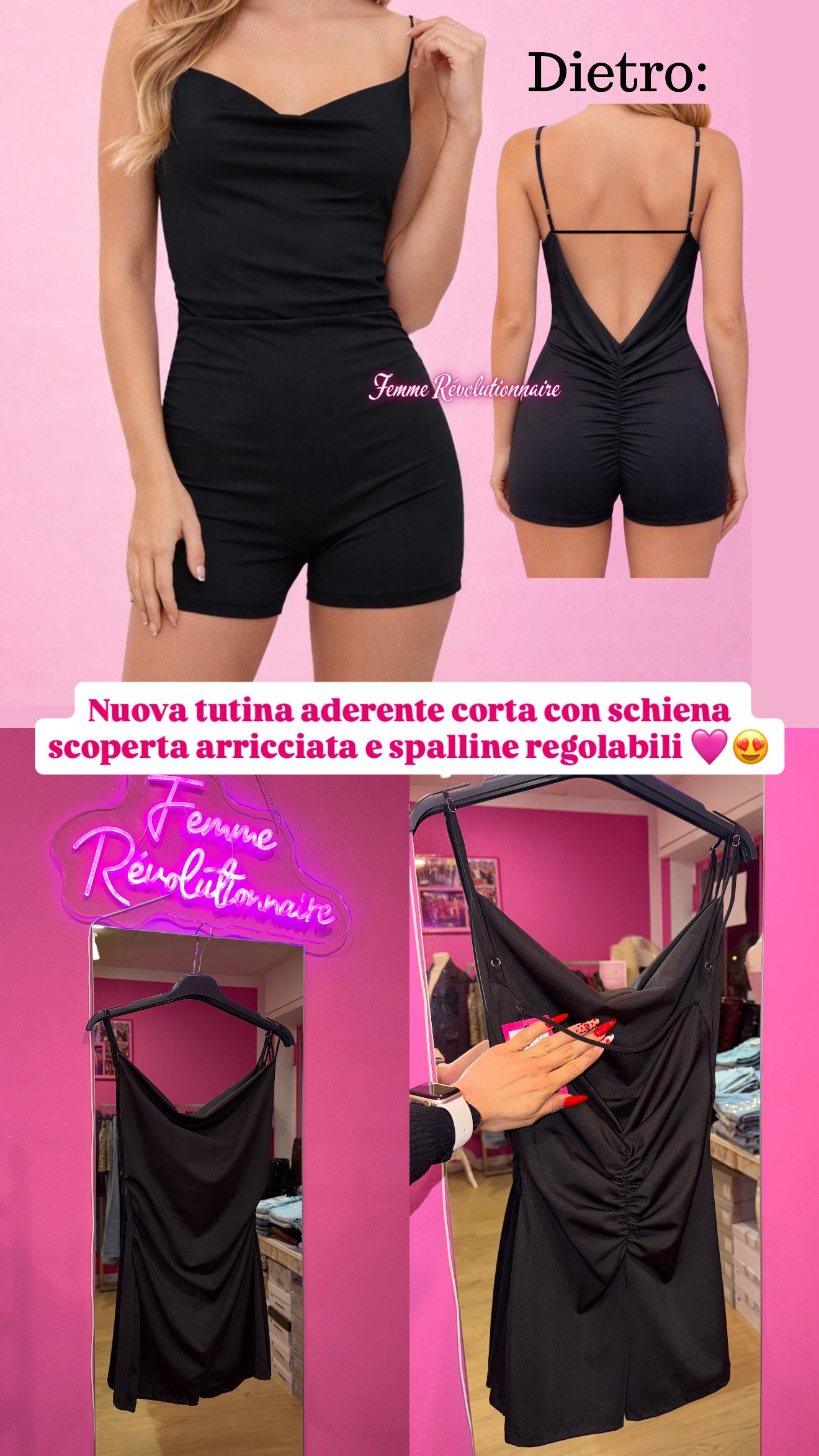 Tutina corta aderente con schiena scoperta arricciata e spalline regolabili.
